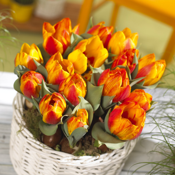 Nehmt die Pflanzen vorsichtig aus den Kunststofftöpfen und spült die Erde mit fließendem Wasser von den Zwiebeln und den Wurzeln ab. Setzen Sie die Zwiebeln in ein schönes Glasgefäß. Damit die Frühjahrsblüher darin Halt bekommen, solltet ihr Moos, kleine Kiesel- oder Glassteine mit ins Gefäß geben. Die Zwiebeln dürfen ruhig sichtbar sein. Auch Weidenkätzchen, Kirschblütenzweige oder Rindenstücke machen sich besonders gut in eurem individuellen Arrangement. Da die Blumenzwiebeln ihre Nährstoffe in der Zwiebel speichern, benötigt ihr nicht zwingend zusätzliche Erde.